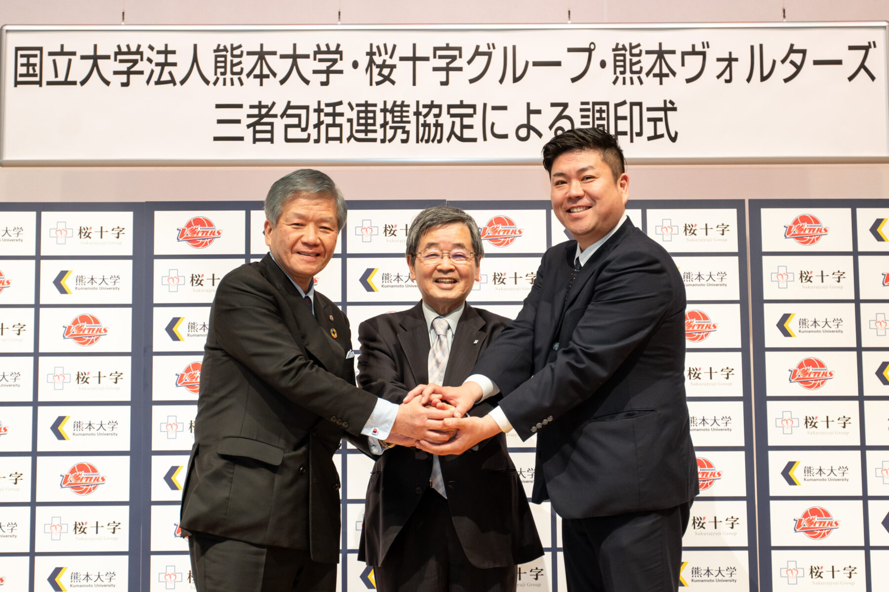 こういったスポーツ振興の取り組みに対し、熊本大学より「渡鹿体育館」を拠点とした 連携協定および共同研究の声かけを頂き、2024 年4 月2 日、熊本大学・桜十字・ヴォルターズの三者による包括連携協定を締結することとなりました。