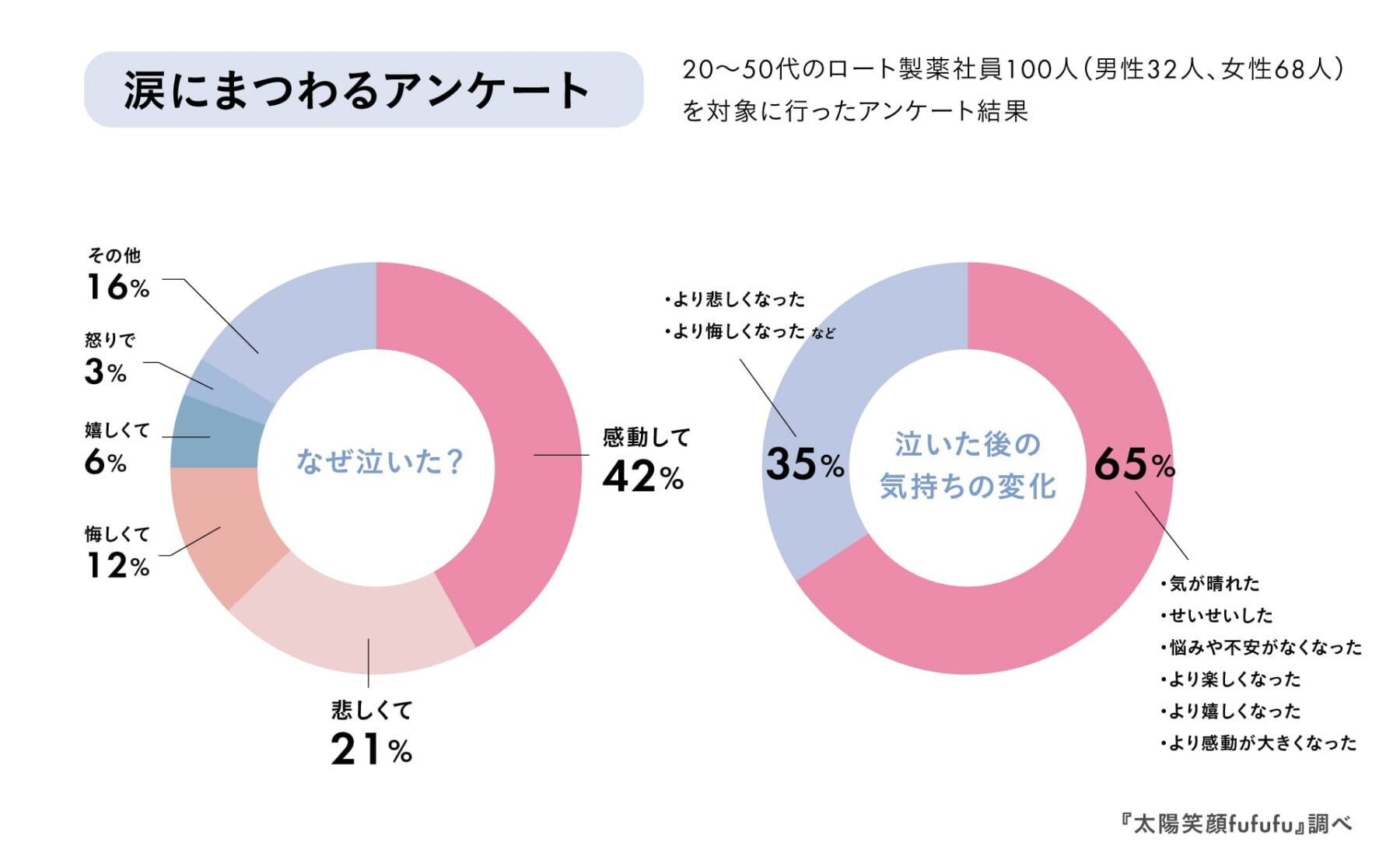 この感情を伴う涙が心理状態に与える影響について心理学的指標を用いた研究も行われています。その1つがPOMS(気分プロフィール検査)で、感動的な映像などによって涙を流した後、緊張・不安・抑うつ・疲労といったネガティブな気分状態が、平均で約10〜30%低下する傾向が報告されています。一方で、前向きな気分を示す「活気(Vigor)」は、約10〜15%上昇する例が確認されています。