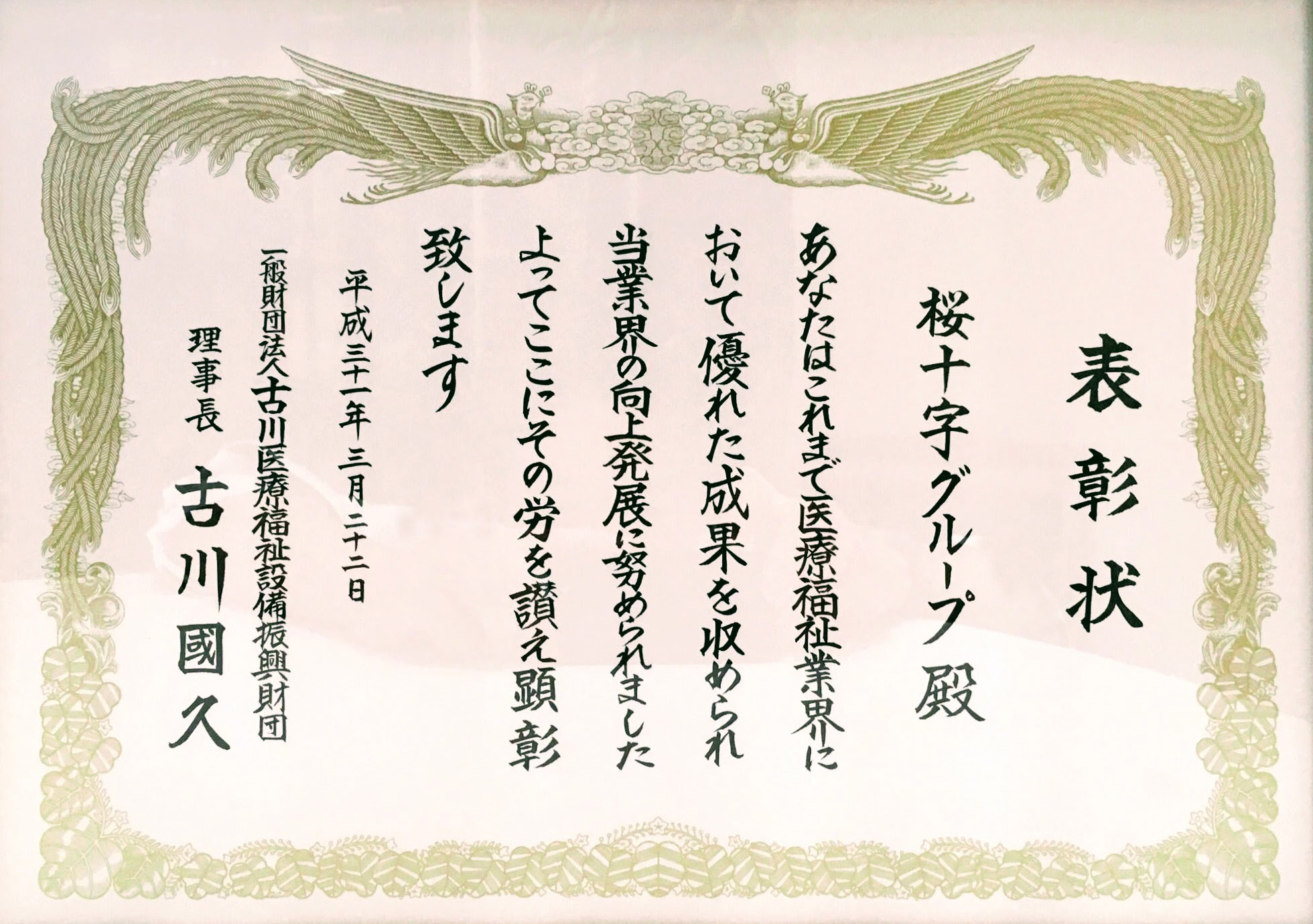 第6回 一般財団法人古川医療福祉設備振興財団 顕彰表彰式・研究助成金贈呈式にて、桜十字グループが「社会活動」の分野において顕彰を受けました。